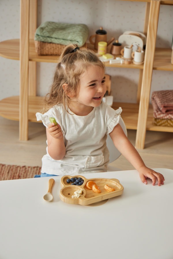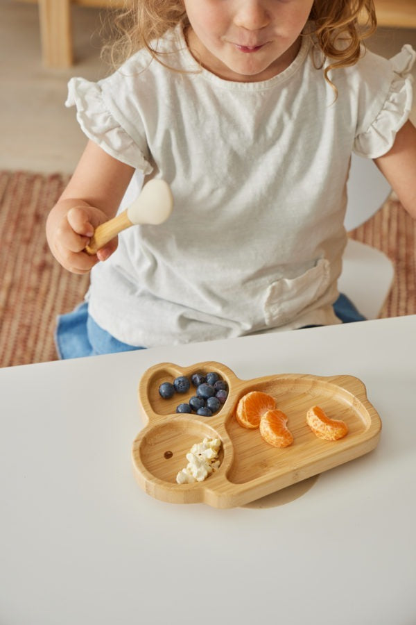 This divider plate comes with a handy inbuilt suction base and a silicone scoop on the spoon that is gentle on little teeth.