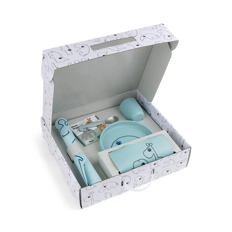 A Silicone Plate, Silicone Mini Mug, Peekaboo Bib, Silicone Placemat and Easy-Grip Spoon are included. Plus, a complimentary Deer Friends Book!