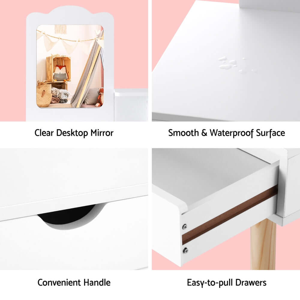 Crafted with strong pine wood legs for exceptional stability, it features a spacious tabletop and large drawers for ample storage. Designed with smooth, rounded corners and reinforced connections, it ensures safe use for children aged 3 to 7. The set includes a matching vanity makeup chair and a mirror for added charm.