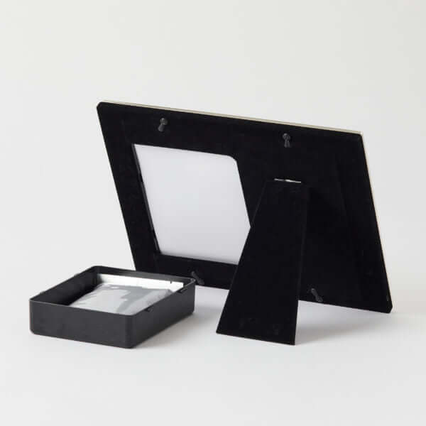 Lullaby DIY Mould kit holds 3.5 x 5” photograph and includes a velvet flocked back and easel stand for portrait-style framing.