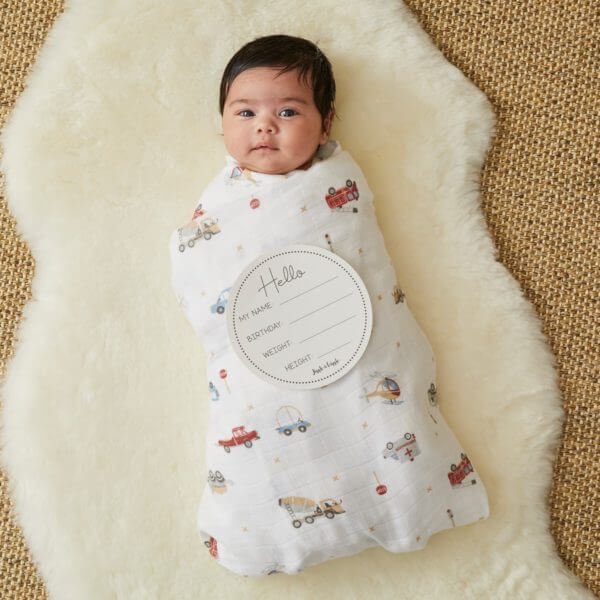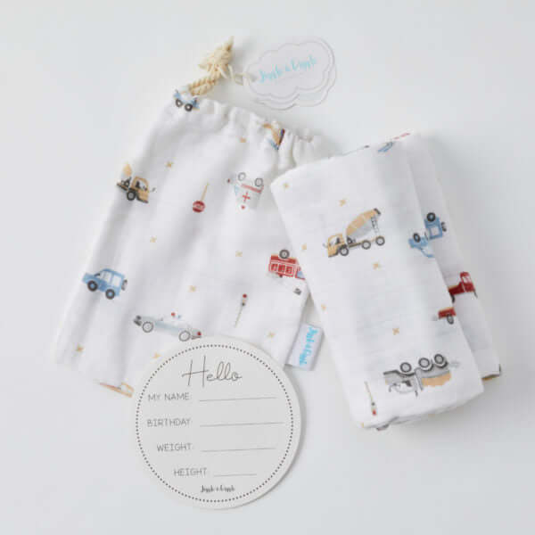 Large, ultra-soft Muslin Wrap with a unique Arrival Card to announce to the world that baby has arrived!