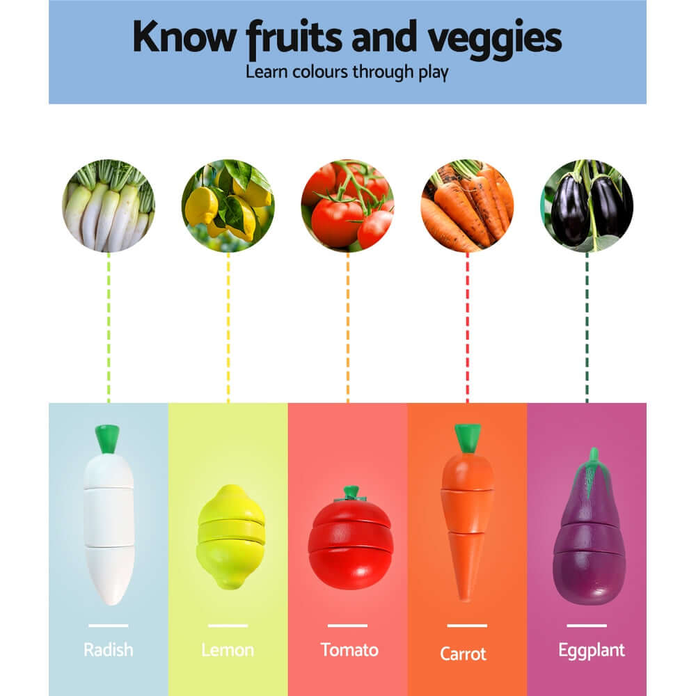 Comprising a 29-piece playset of fruits, vegetables and kitchenware, this colourful set lets your child pretend-slice fruits and vegetables, arrange table settings, clean up and store!
